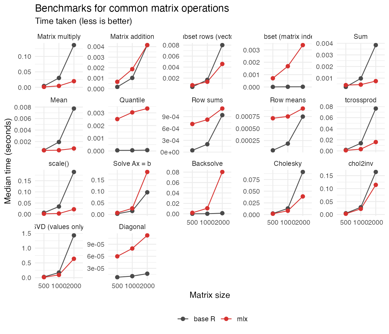 This vignette compares base R and MLX timings across core matrix routines.