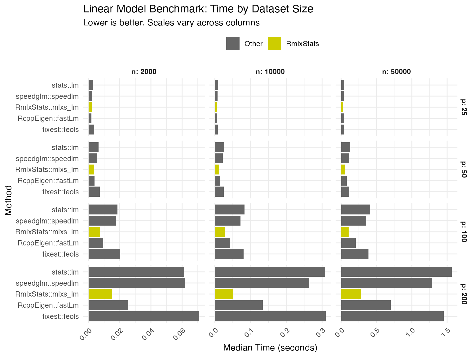 bench_grid <- bench_grid[bench_grid$n > bench_grid$p, ]Linear Model Benchmarks
